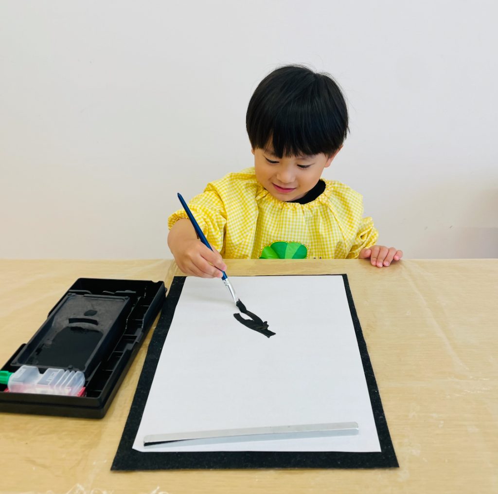 実際の墨汁を使用して、絵の具の筆でお習字体験もしました✨