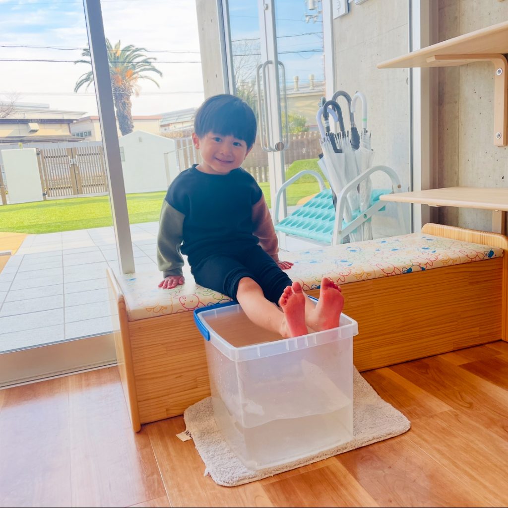 園庭で裸足になって、たくさん身体を動かした後は、足湯でリラックスTime♨✨