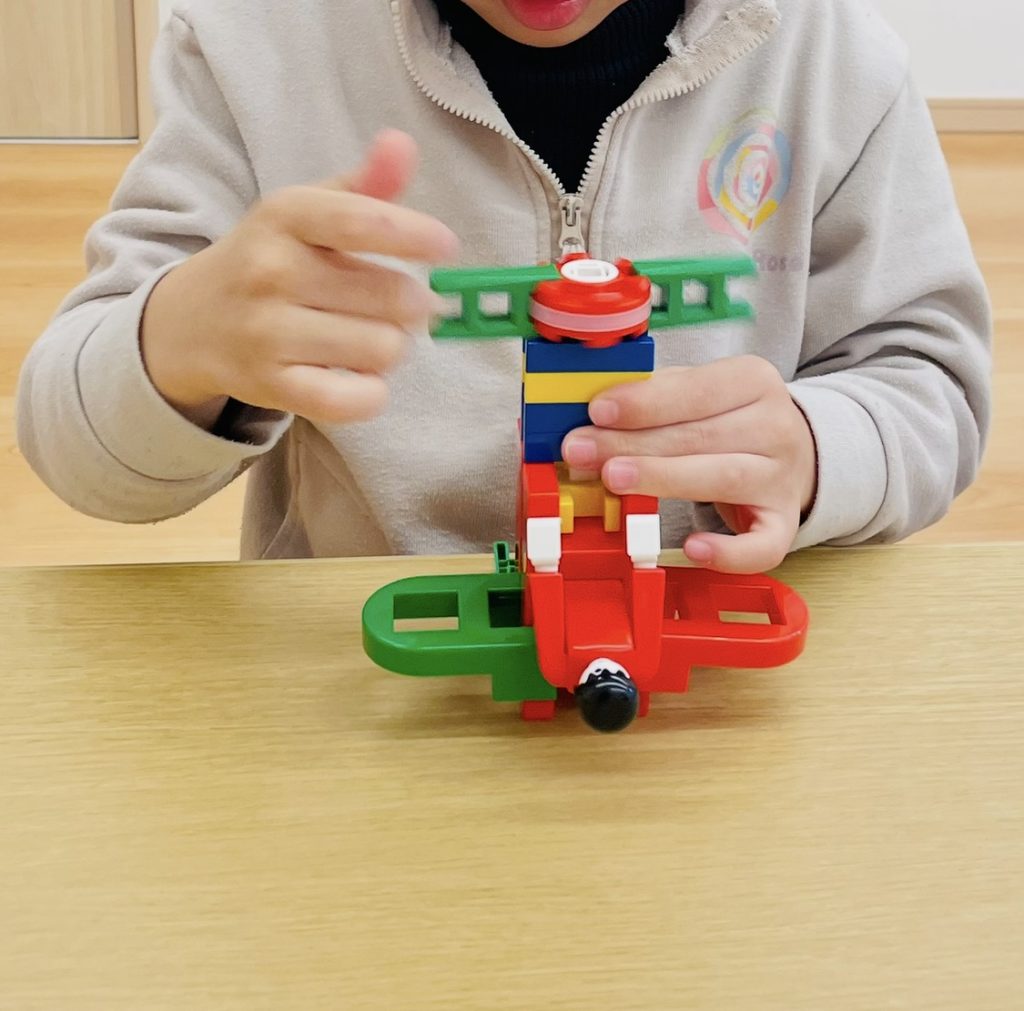 ブロックで作った飛行機を手に持って、教室で飛ばしました♪