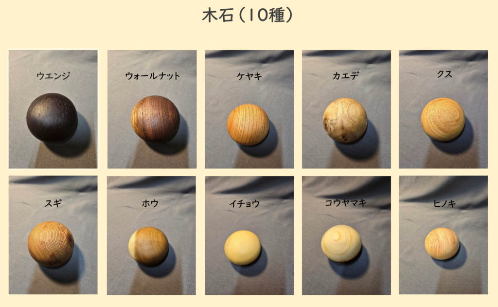 丸いお盆に入った木石たちはまるで和菓子のよう。上の表をみて、どの木がどの名前か調べてみてくださいね。この木石たちは、体験レッスンはもちろん、日ごろのレッスンにも登場しますよ。