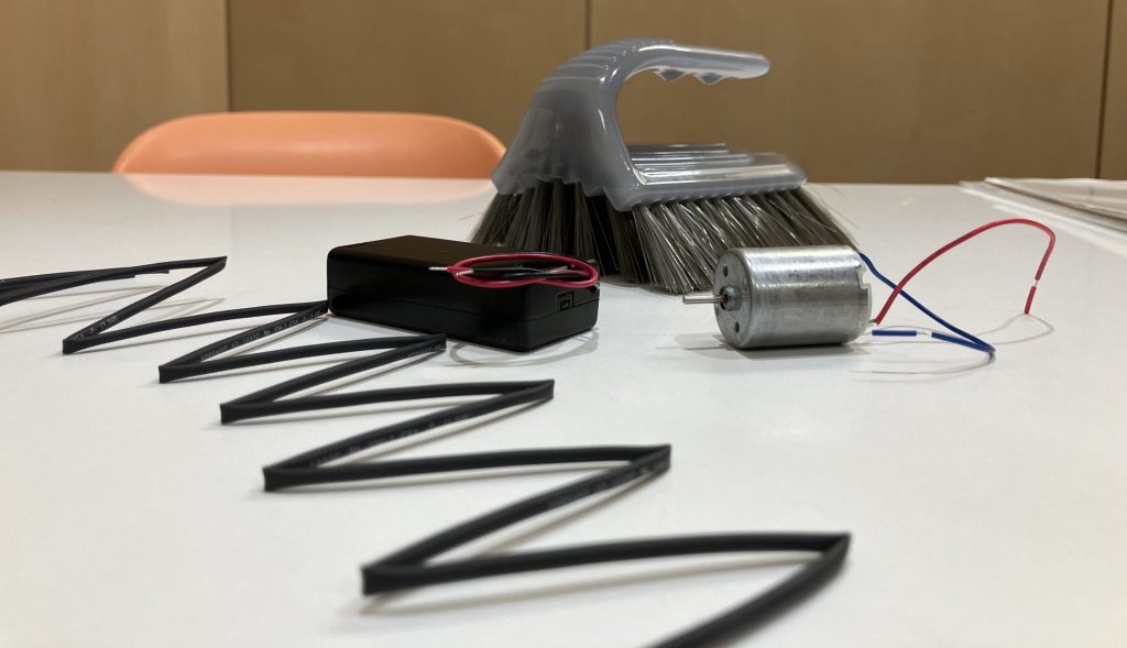 いろいろな道具や部品がテーブルの上にいますよ。