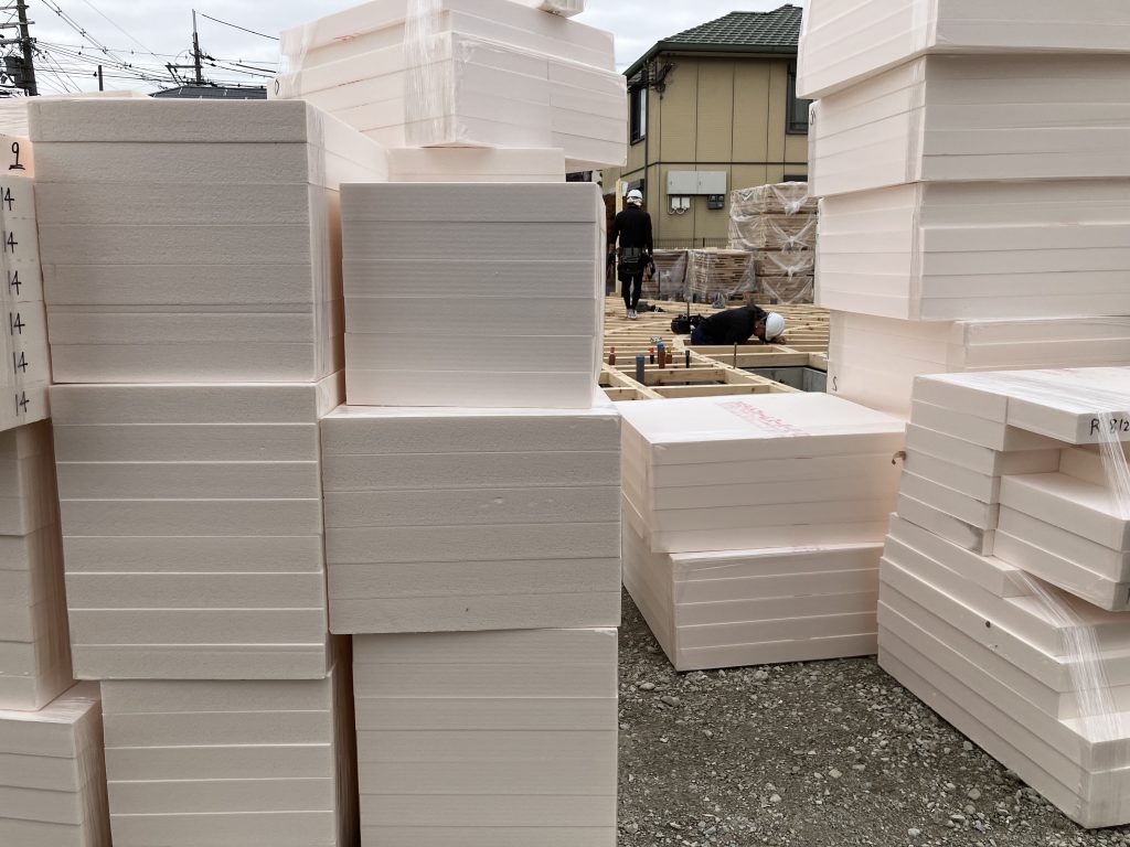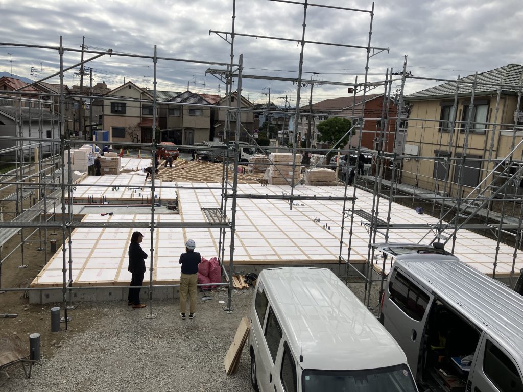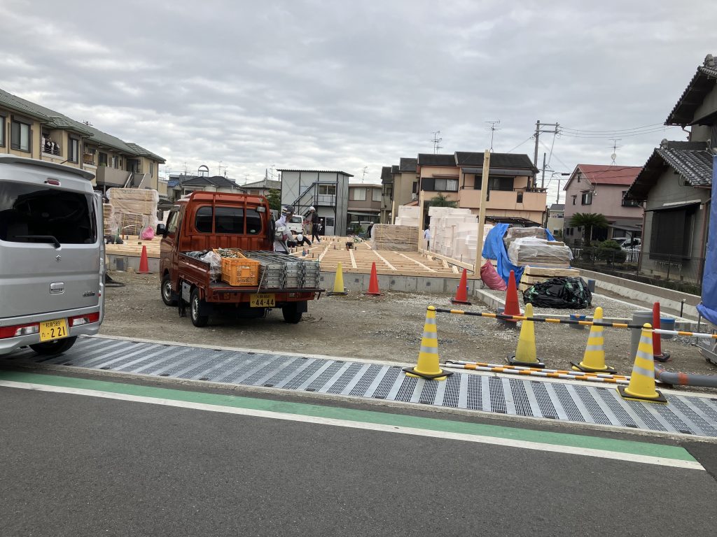 先日、コンクリートが流し込まれたと思いきや、床部分に木枠が。あれよあれよと言ううちに、鉄骨が建てられ、壁を設置する準備が着々とΣ(・ω・ノ)ノ!