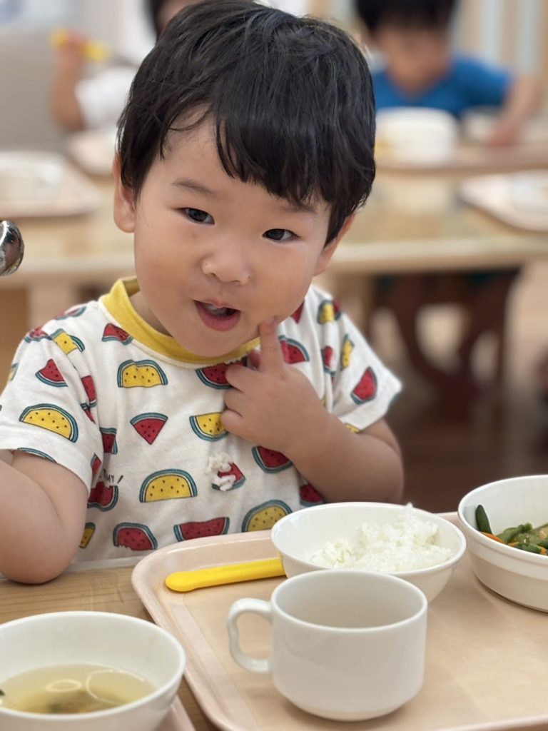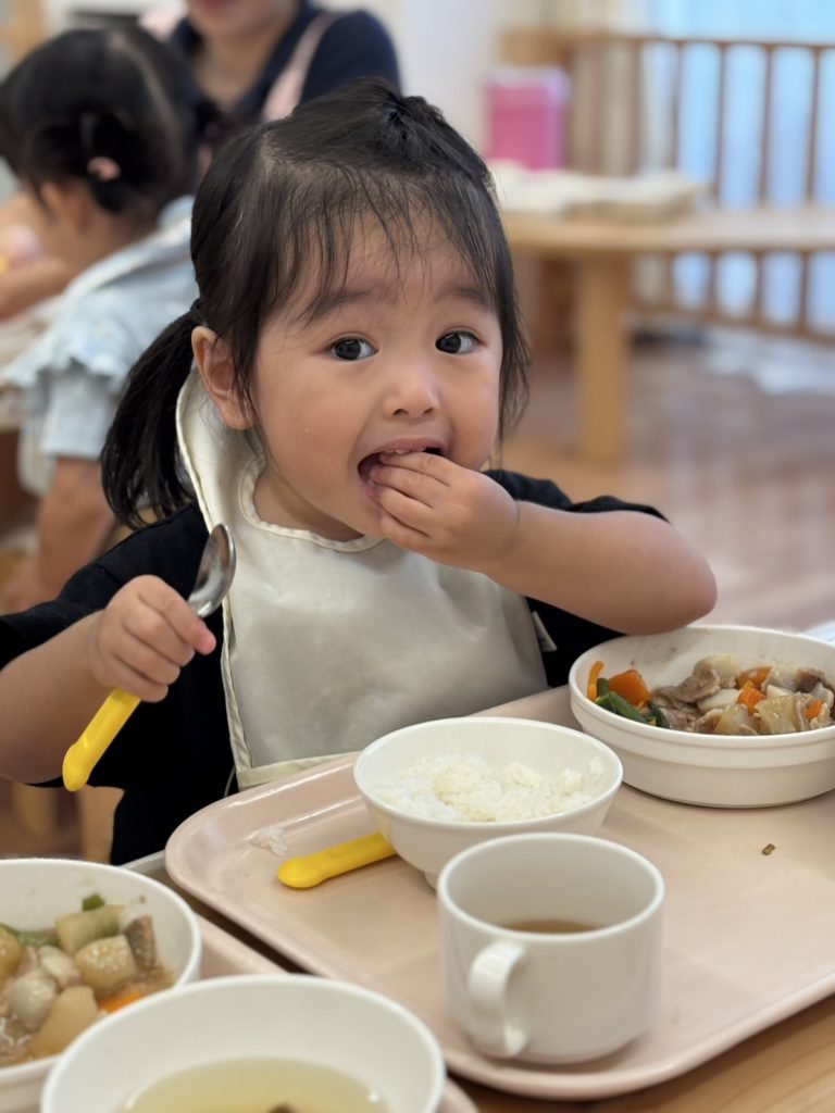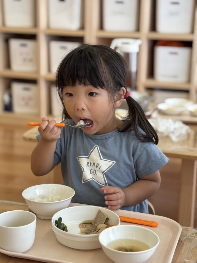 「お肉食べられたよ!」「ごはんおかわりする!」と笑顔で話す子どもたち。先生が「おいしいね」と声をかけると、テーブル全体があたたかい空気に包まれます。