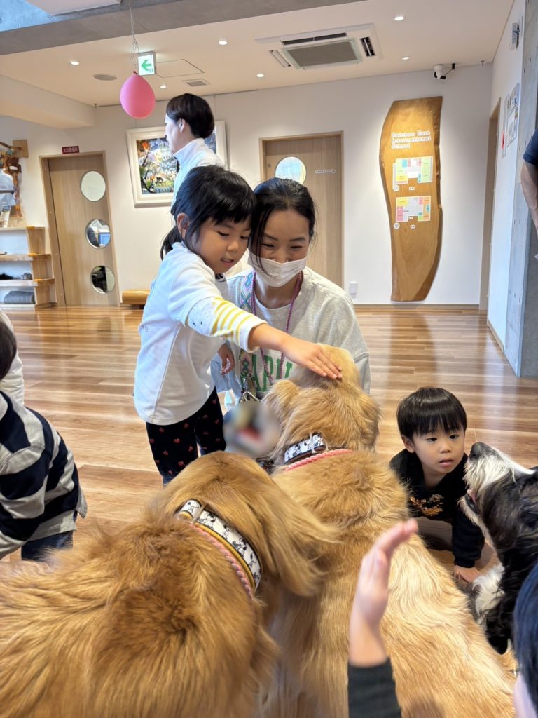 最初は少し距離を取って見ていた子どもたちも、ワンちゃんの穏やかな表情としっぽの揺れに誘われて、少しずつ近づいていきました。