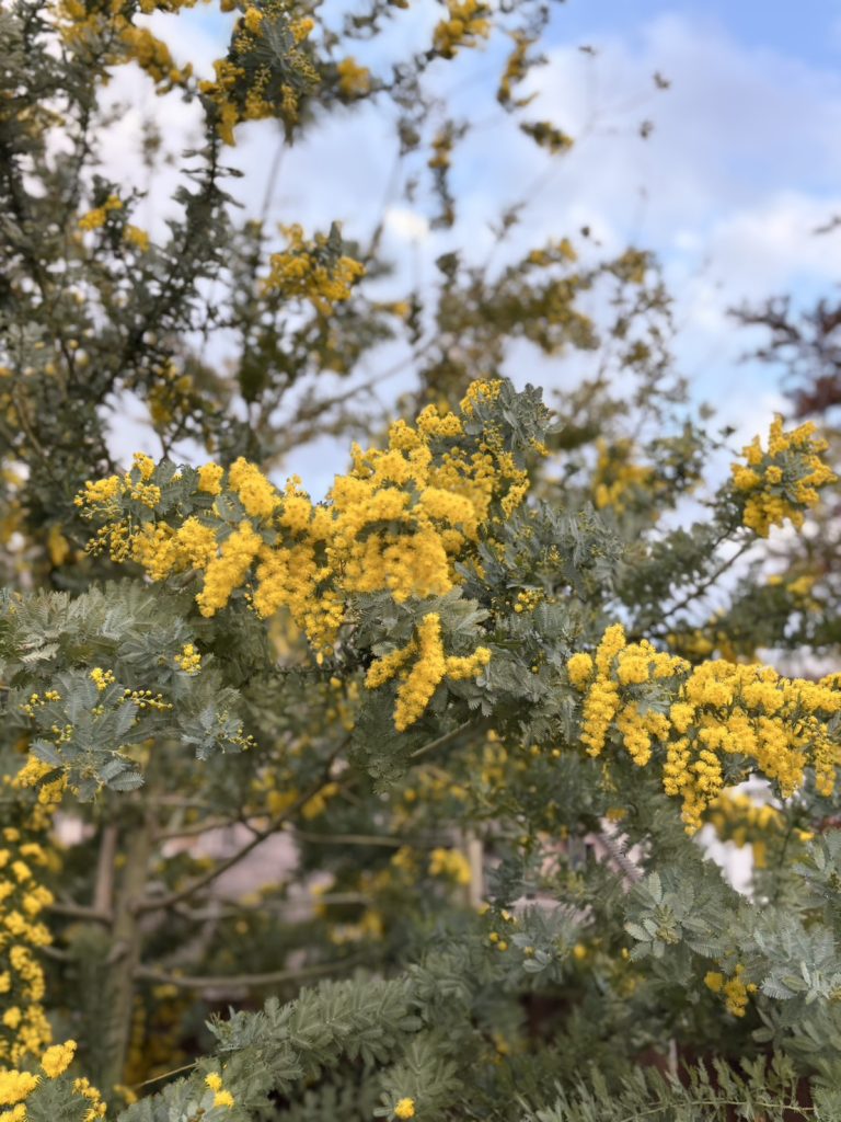 スクールの入り口には、大きなミモザの木があります。