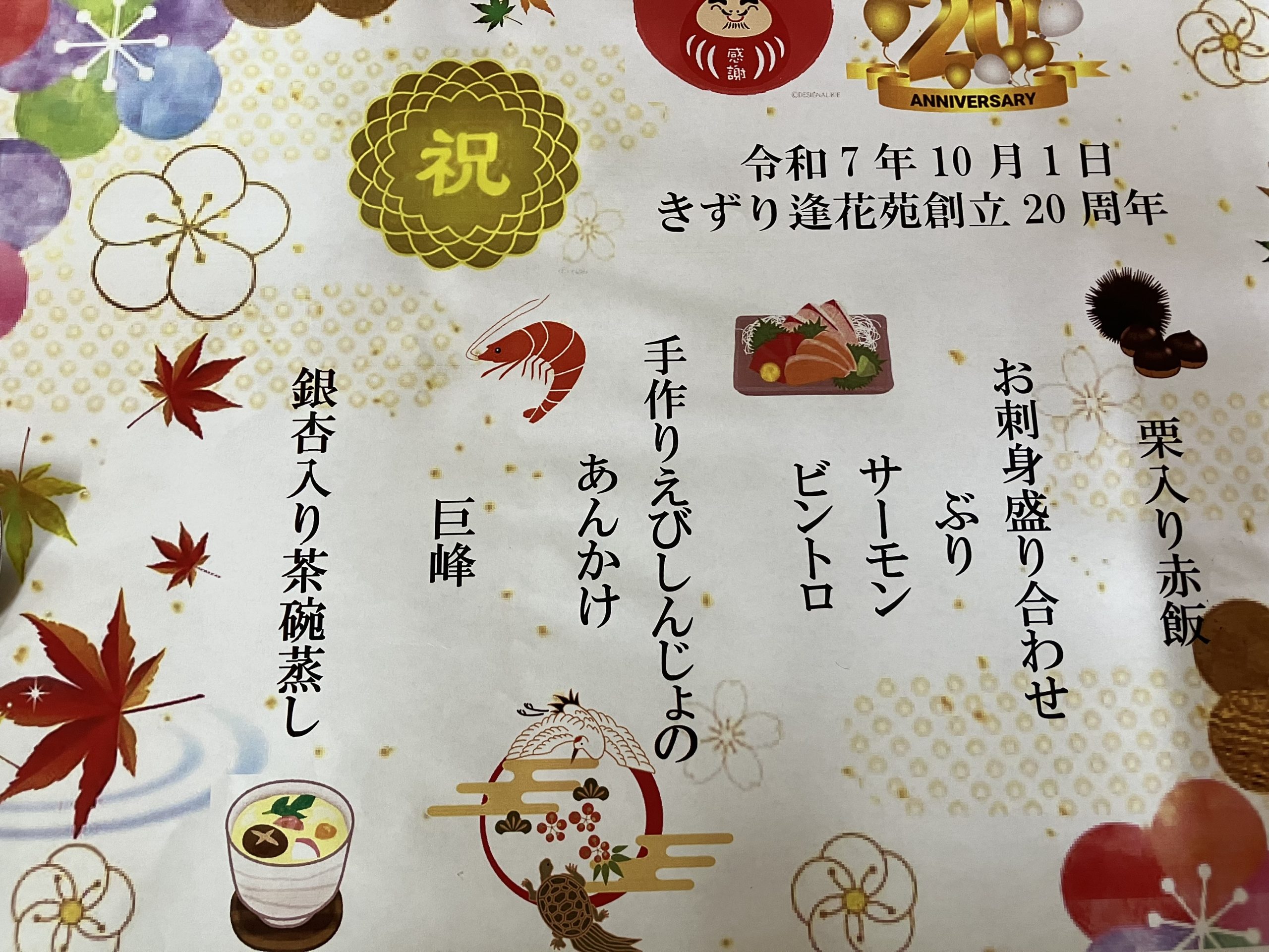 ちょっと過ぎてしまったのですが・・・ 10月1日(水)に我が施設(きずり逢花苑)なんと!!20周年を迎えましたヾ(*´∀`*)ノ この日は、皆でお祝いご飯を美味しく頂きました♡ …