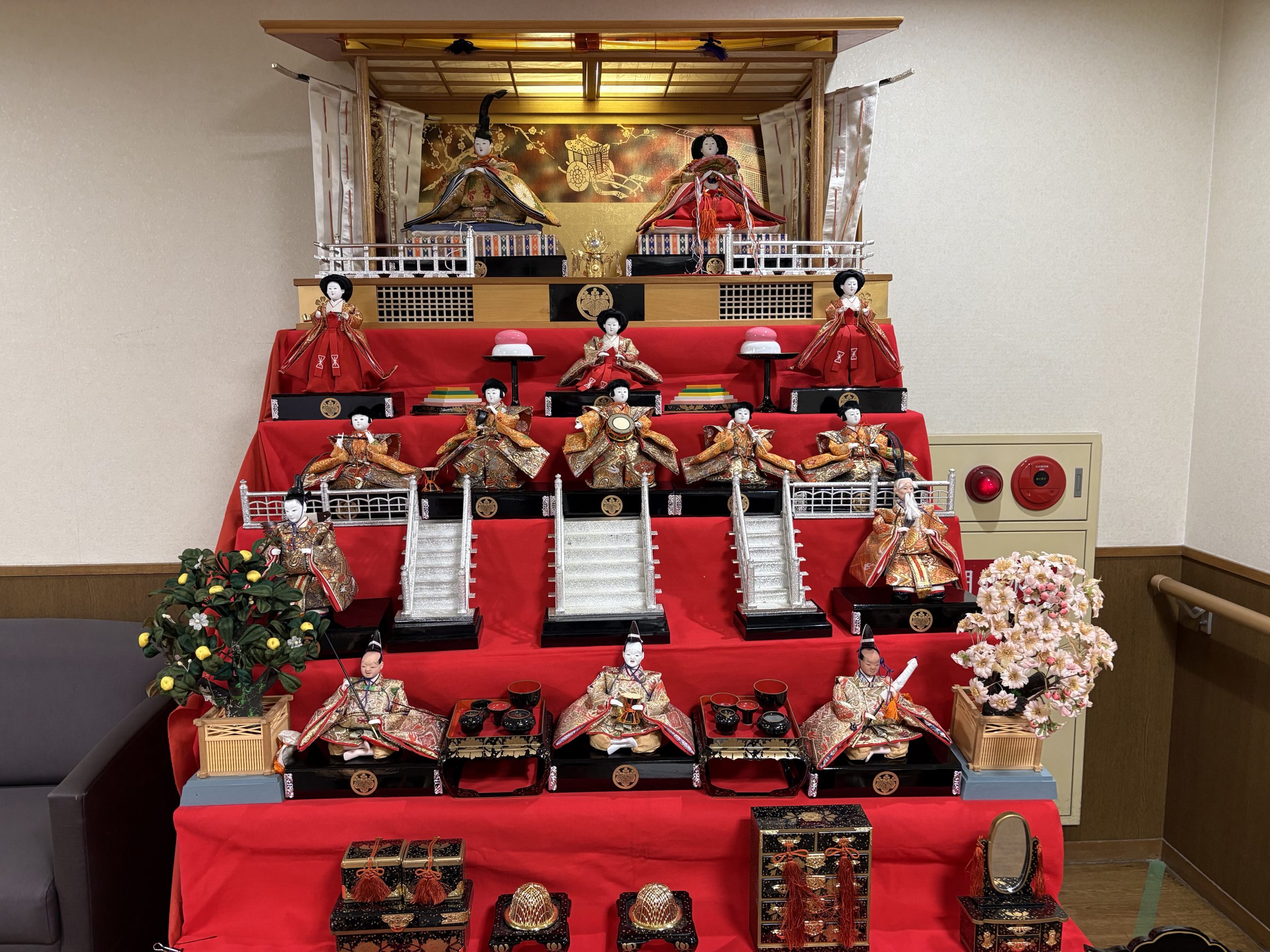 節分が終われば、2月は直ぐに逃げてしまいます~ 3月 🎎 ひな祭りですね・・ ながよし苑1階 エレベーター前に、お雛様が飾られました。 華やかな、七段飾りのお雛様です・・ 桃の花・菜の花の飾り…